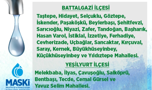 Konu ile ilgili olarak MASKİ Genel Müdürlüğü'nden yapılan açıklamada, “Battalgazi İlçesi’ne bağlı Taştepe, Hidayet, Selçuklu, Göztepe, İskender, Paşaköşkü, Beylerbaşı, Şehitfevzi, Sarıcıoğlu, Niyazi, Zafer, Tandoğan, Başharık, Hasan Varol, İstiklal, İzzetiye, Ferhadiye, Cevherizade, Uçbağlar, Sancaktar, Kırçuval, Saray, Kernek, Büyükhüseyinbey, Küçükhüseyinbey, Yıldıztepe, Yeşilyurt İlçesi’ne bağlı Melekbaba, İlyas, Çavuşoğlu, Salköprü, Bentbaşı, Tecde, Cemal Gürsel ve Yavuz Selim Mahallesinde içme suyu ana isale hattı üzerinde oluşan arıza nedeniyle 16 Nisan Salı günü saat 09.00 ile 17.00 saatleri arasında su verilemeyecek. Kesintinin uygulanacağı 34 mahallede yaşayan vatandaşlarımızın mağdur olmamaları için gerekli tedbirleri alması gerekmektedir. Anlayışınızdan dolayı şimdiden teşekkür ederiz” denildi.